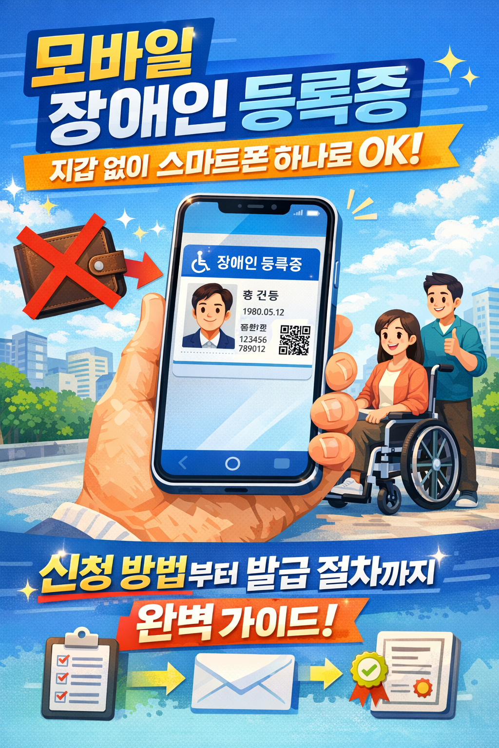 모바일 장애인 등록증 신청 방법을 한눈에 정리했습니다. QR·IC 발급 차이, 준비서류, 증명사진 규정, 수수료, 신청 전 유의사항까지 단계별로 쉽게 안내해 드려요. 전국 행정복지센터에서 바로 신청 가능하며, 초보자도 이해할 수 있는 친절한 가이드입니다