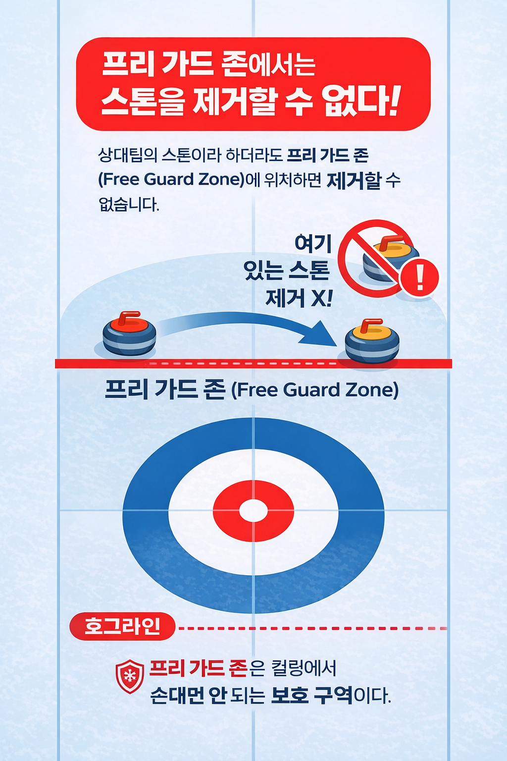 전략적으로 매우 중요한 룰입니다. 각 엔드의 첫 5개 스톤이 하우스와 호그라인 사이(프리 가드 존)에 위치할 경우, 상대 팀은 이 스톤을 밖으로 쳐낼 수 없습니다. 만약 쳐내서 밖으로 나갔다면, 나간 스톤은 원래 위치로 복구되고 공격한 팀의 스톤은 제거됩니다.