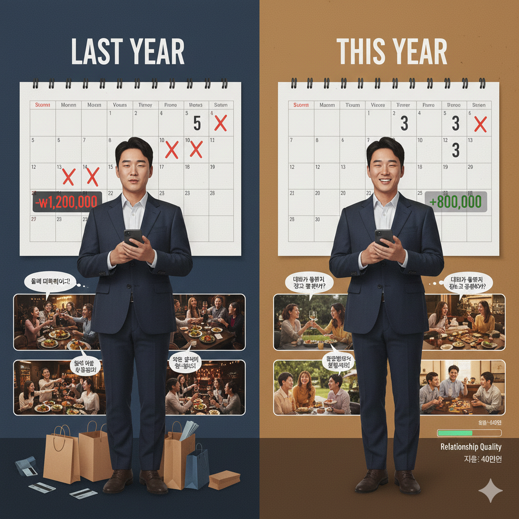 일상 사례: 프리랜서 박 씨는 작년 12월에 친구들과의 "마지막 모임"을 5번 가졌습니다. 매번 "올해 마지막이니까"라는 말과 함께 고급 레스토랑을 선택했고, 총 120만원을 썼습니다. 올해는 모임 횟수를 3번으로 제한하고, 장소는 "대화가 중요하지 장소가 중요한가?"로 기준을 바꿨습니다. 지출은 40만원으로 줄었지만 관계의 질은 더 좋아졌습니다.